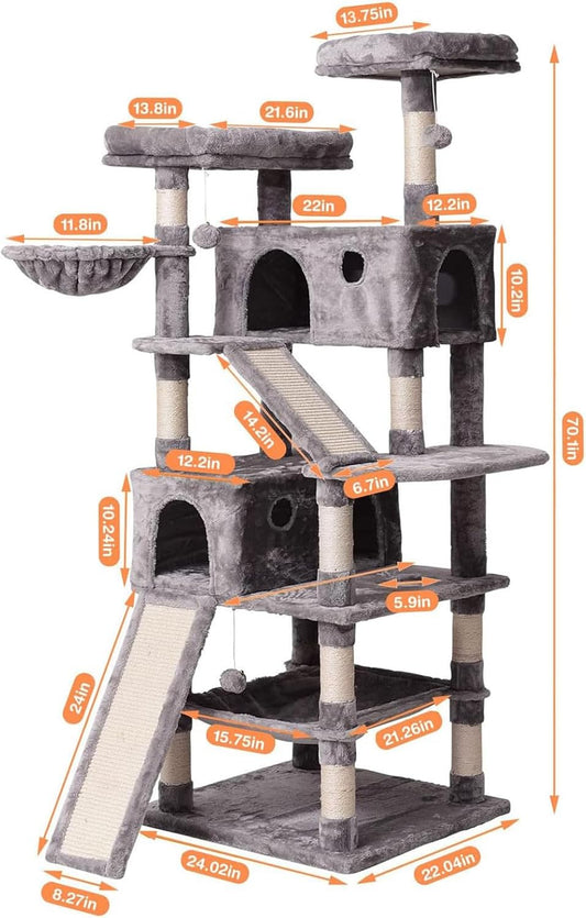 Cat Tree Cat Tower 70.1 In, Multi Level Cat Scratching Post with Condos, Ladders, Basket, Hammock & Plush Perches for Kittens, Large Cats, Light Gray